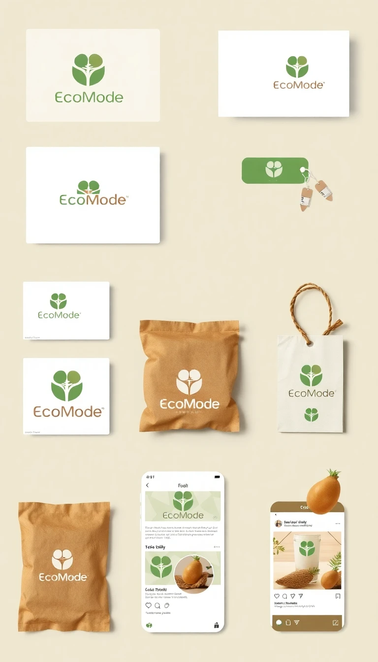 Création de l'identité visuelle pour une marque de vêtements éco-responsables avec packaging recyclable et étiquettes biodégradables.
