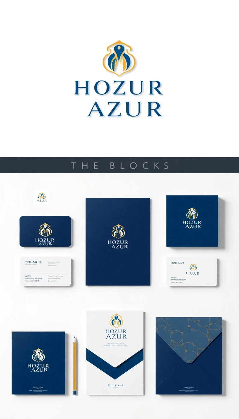 Création d'une identité de marque complète pour un hôtel de luxe en bord de mer incluant logo, cartes de visite et signalétique.